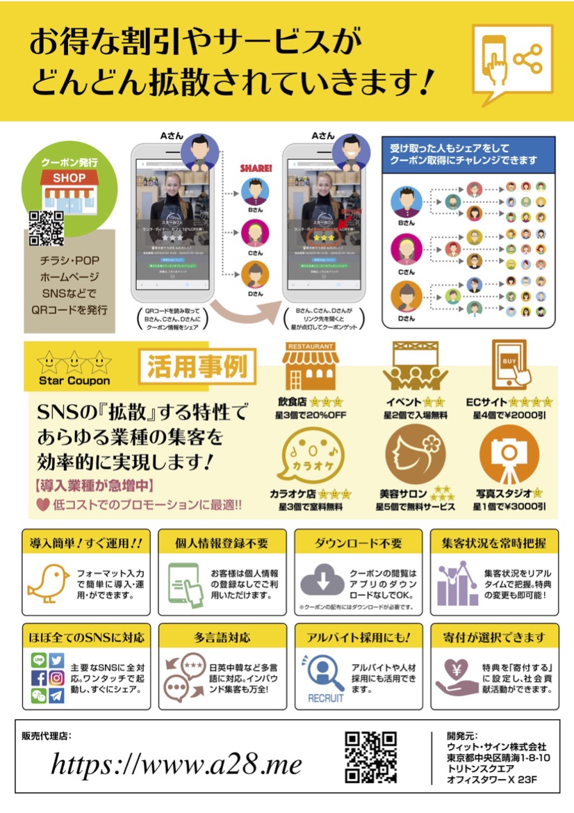 既存客の人脈経由で集客出来る星クーポンサービスは2017年の新サービスとして上場企業も利用されて、いい船出しができました。 利用店鋪と代理店を募集しています(代理手数料50%以上) 。