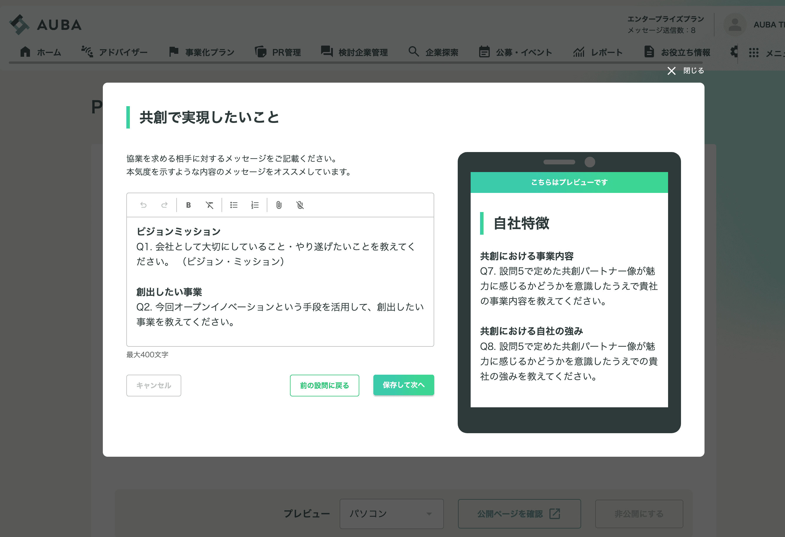 ※AUBA掲載情報をAUBA上でのオープンイノベーションを目的としたメッセージ送信以外に活用することは本サービスの利用規約違反となります。「AUBA掲載情報をみた」としてAUBA外での営業活動に掲載情報を活用することはご遠慮ください。