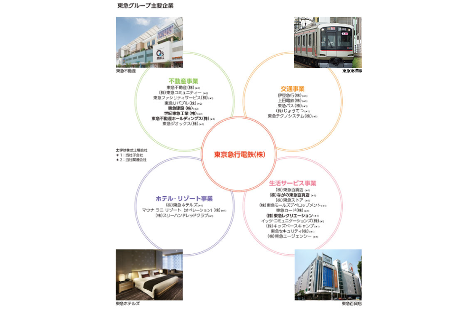 - ■鉄道事業 年間乗降人員11億人以上と、私鉄日本一の乗降人員を誇る当社は、さらに安心安全で便利な沿線を目指し、様々な取り組みを行っています。2020年までに東横線・田園都市線・大井町線の3路線全駅でのホームドア設置の計画を進めたり、他社線との相互直通運転による更なる利便性の向上を目指しています。 ■都市開発事業 沿線価値の向上を目指し、開発だけにとどまらず持続的な街づくりを進めるための運営も進めております。 ■生活サービス事業 フィットネスジム、スーパーマーケットやカード事業、ケーブルテレビ事業等の利便性・快適性を高める商品・サービスの提供により、沿線にお住いのお客様の生活価値向上をグループ一体となって目指します。