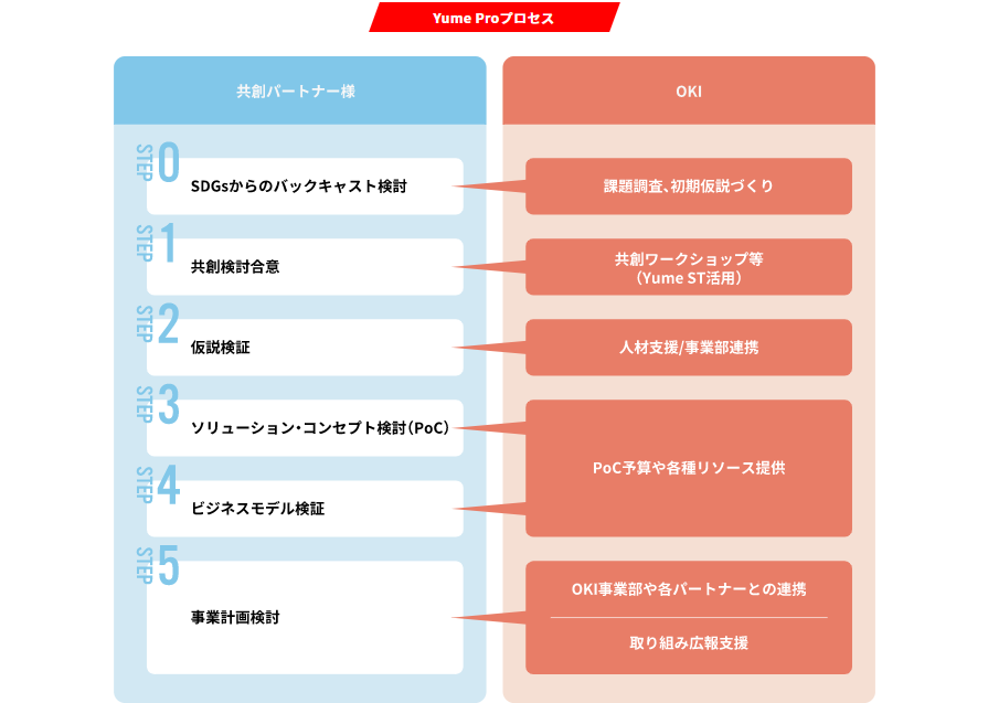 「Yume Pro」は、社会やお客様の課題を解決し、共創パートナー様と共に夢を拓く、OKIの新たなイノベーション創出活動です。特徴としては大きく3つです。 ① SDGsに掲げられている社会課題にフォーカス。 ② 共創パートナー様に対し、課題解決の役に立つカスタマイズしたワークショップをOKIが自ら企画し、開催。 ③ 事業化を円滑化するための仕組みを整備。事業部や営業と連携する社内体制、PoCを実施するための十分な予算を確保しリーンスタートアップを可能に。 2018年からスタートした「Yume Pro」は、2期目を迎え、ますますパワーアップしています。独自のイノベーションプロセスも構築し、しっかりと課題解決への仮設を立て、本格的な事業化に取り組んでいきます。提供リソース