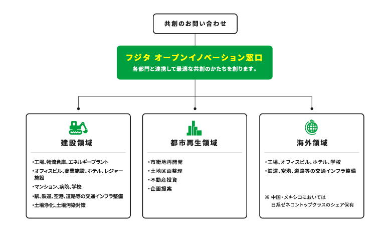 当社は、国内外で年間平均約300カ所の建設現場を手がけているだけではなく、市街地の再開発など街づくりのノウハウも有しています。さらに、長年当社が培ってきた技術を集積した「フジタ技術センター」(神奈川県厚木市)の協力体制も整えており、共創パートナー企業と共に、ビジネスを実装させる“場”や“知見”が数多くあります。また、当社は海外事業にも注力しており、中国・メキシコにおいては日系ゼネコントップクラスのシェア保有。全世界に広がるネットワークを活かすことも可能です。提供リソース