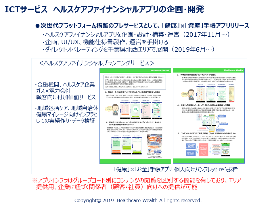 ・ヘルスケアファイナンシャルアプリ(~2018年ヘルスケア関連アプリ4案件企画・開発実績)及びヘルスケアプラットフォーム(~2018年2案件企画・運営)の企画、開発、運営