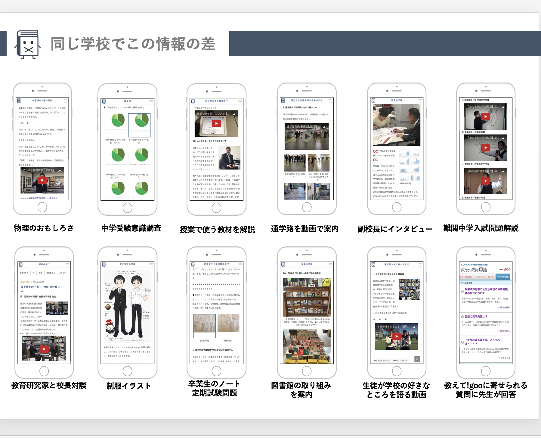 - 受験生と保護者の指向を判断し、最適な学校や教育環境の情報を提供する ”わが子に合う教育をみつけるサイト” 「中学図鑑」「塾図鑑」 の運営