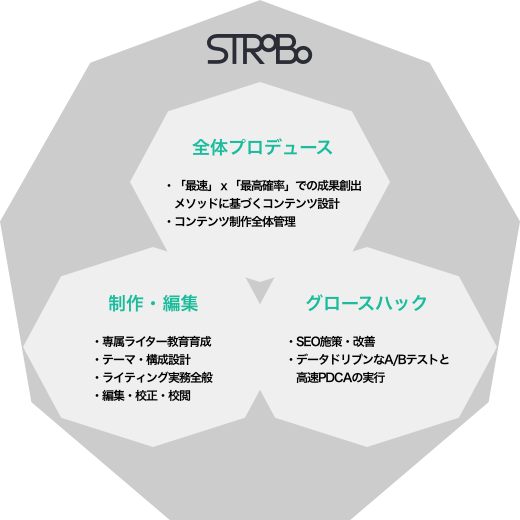 ストロボは、デジタル系事業の成功を左右する重要なファクターの一つが「コンテンツ」であると考え、支援対象企業ごとに専門のコンテンツ編集体制を築き、成果向上を目指すグロースハックスペシャリストを育成するなど、独自のマーケティングノウハウやオペレーションメソッドを展開しています。