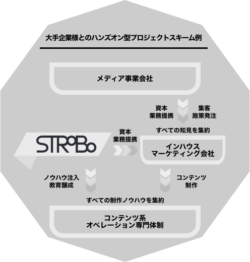 一方、コンテンツ制作の全てを顧客企業が内製することには限界があります。そこで、ストロボを軸とした様々なスペシャリスト企業が同志的なパートナーシップを作ることで、一緒に顧客企業にコミットしたいと考えています。