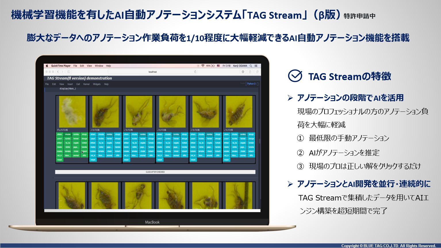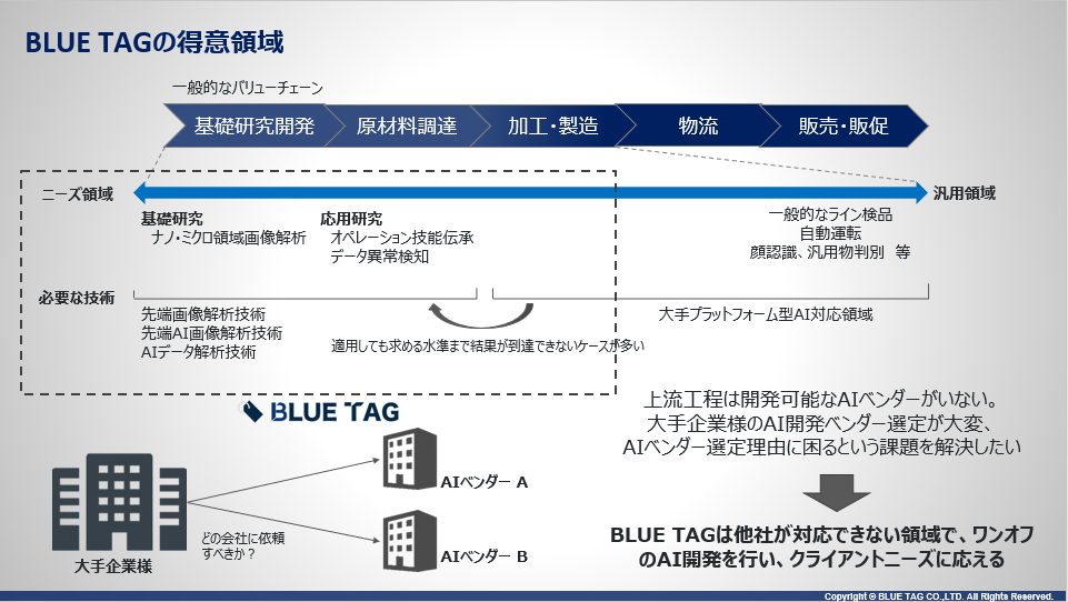 BLUE TAGは、画像解析×AIの価値が多くの産業に広まり日本の画像AI市場が成熟することが重要であると考えます。個社の特定分野のみに適用できるというような特殊な課題でも対応し、他社が解決できないような困難な課題に対しても現場で本当に使えるソリューションとして提供できることがBLUE TAGの最大の強みであり、差別化要素です。困難な課題であるほどBLUE TAGの価値が発揮されます。
