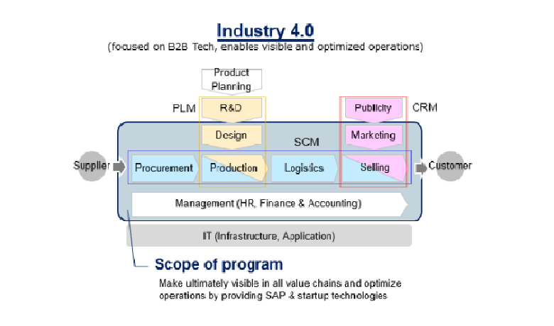 企業経営における一連のバリューチェーン(研究開発、調達、生産、ロジスティックス、販売/マーケティング、アフターサービス)と人材管理、財務・経理などの経営管理のそれぞれのプロセスにおいて、先端技術の活用によるイノベーションを志向。 SAPが提供する製品/テクノロジーとの連携により、日本の産業に変革をもたらすエンタープライズ/B2B向けTechnokogy Startupを支援。 製造業あるいは製造プロセスのみを対象とするのではなく、その周辺の流通や小売、サービス業等向けも含め、究極的なオペレーションの可視化および最適化の実現を目指す。求めている条件