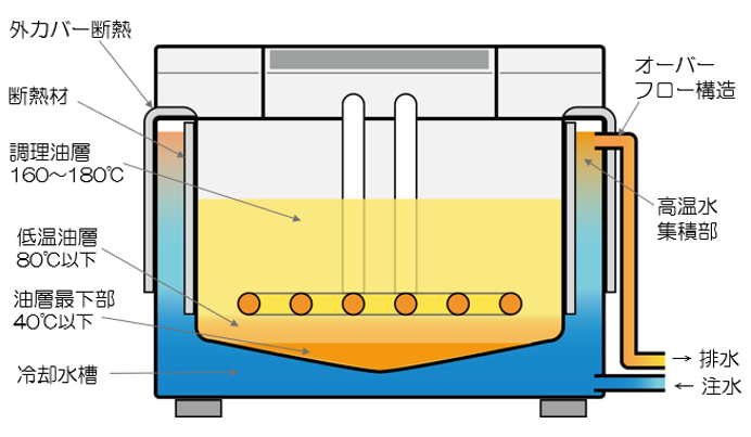 ・これらの実装により油交換を必要とせず、新鮮な油で揚げ調理を継続することを実現します。