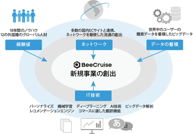 BeeCruise株式会社は、BEENOSグループの「経験値」「ネットワーク」「データの蓄積」といった強みとIT技術を駆使し、既存事業の成長の加速化と新規事業の開発を行うために立ち上げた戦略的事業会社です