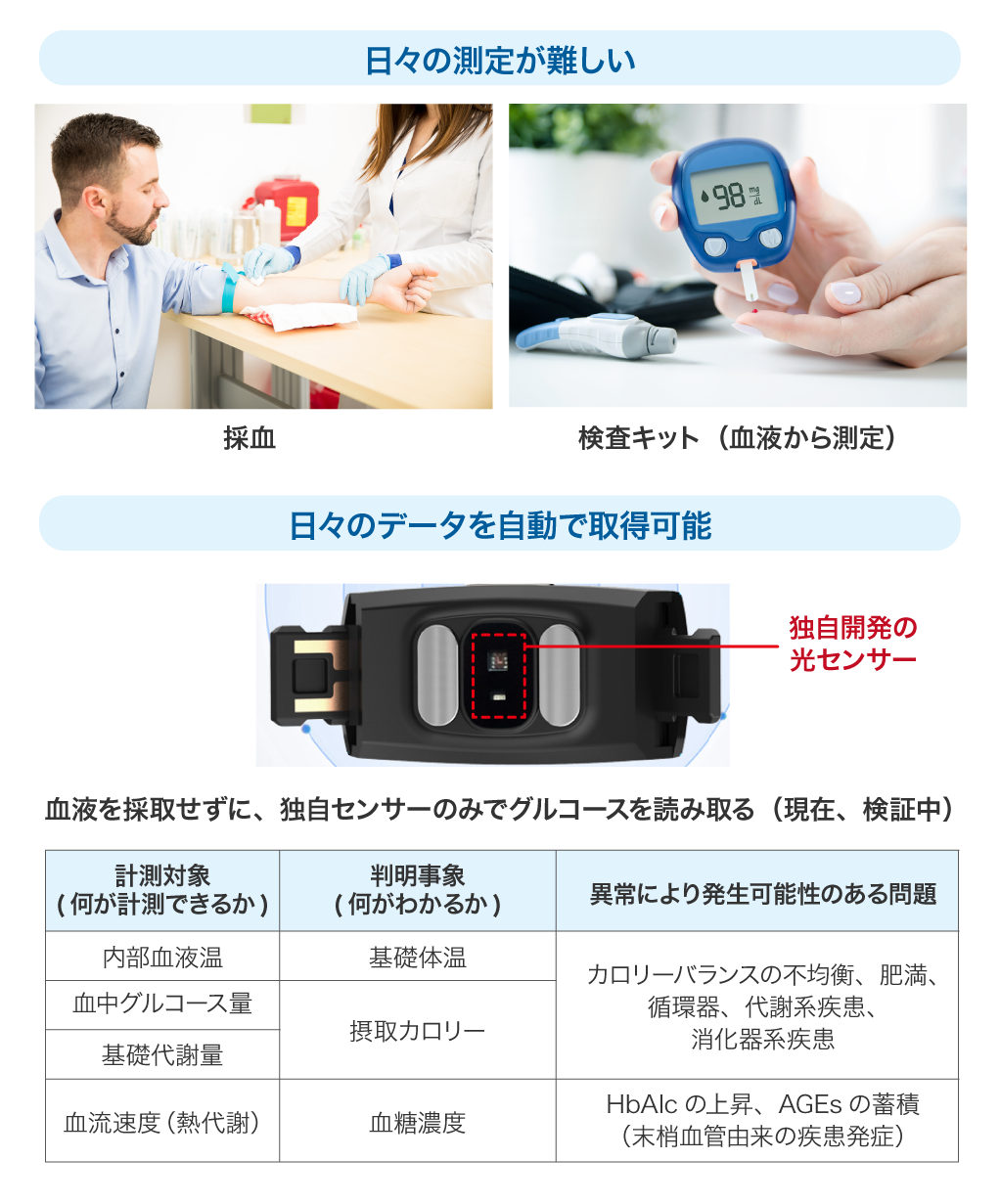 そして、現在開発段階である、第Ⅱフェーズでは血中グルコース等の計測が可能になるよう、センサーの検証を行っています。現在、針を使わずにグルコースが計測できる、非侵襲型で小型のバイタルセンサーが市場に存在しないため、当センサーの開発は市場に大きなインパクトを与えると考えています。また、当センサーが開発できると、カロリーバランスの不均衡や癌化予知など、幅広い健康データをワンストップで容易に計測できるようになり、誰もが体の不調を即座に把握できることを目指します。